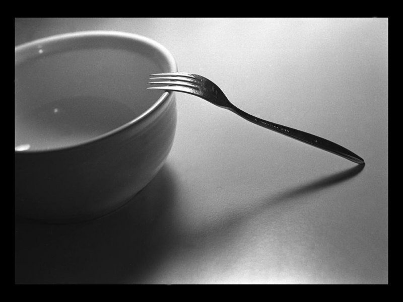 Still life photo of a bowl and a fork. Pretty plain and simple, yet elegant.