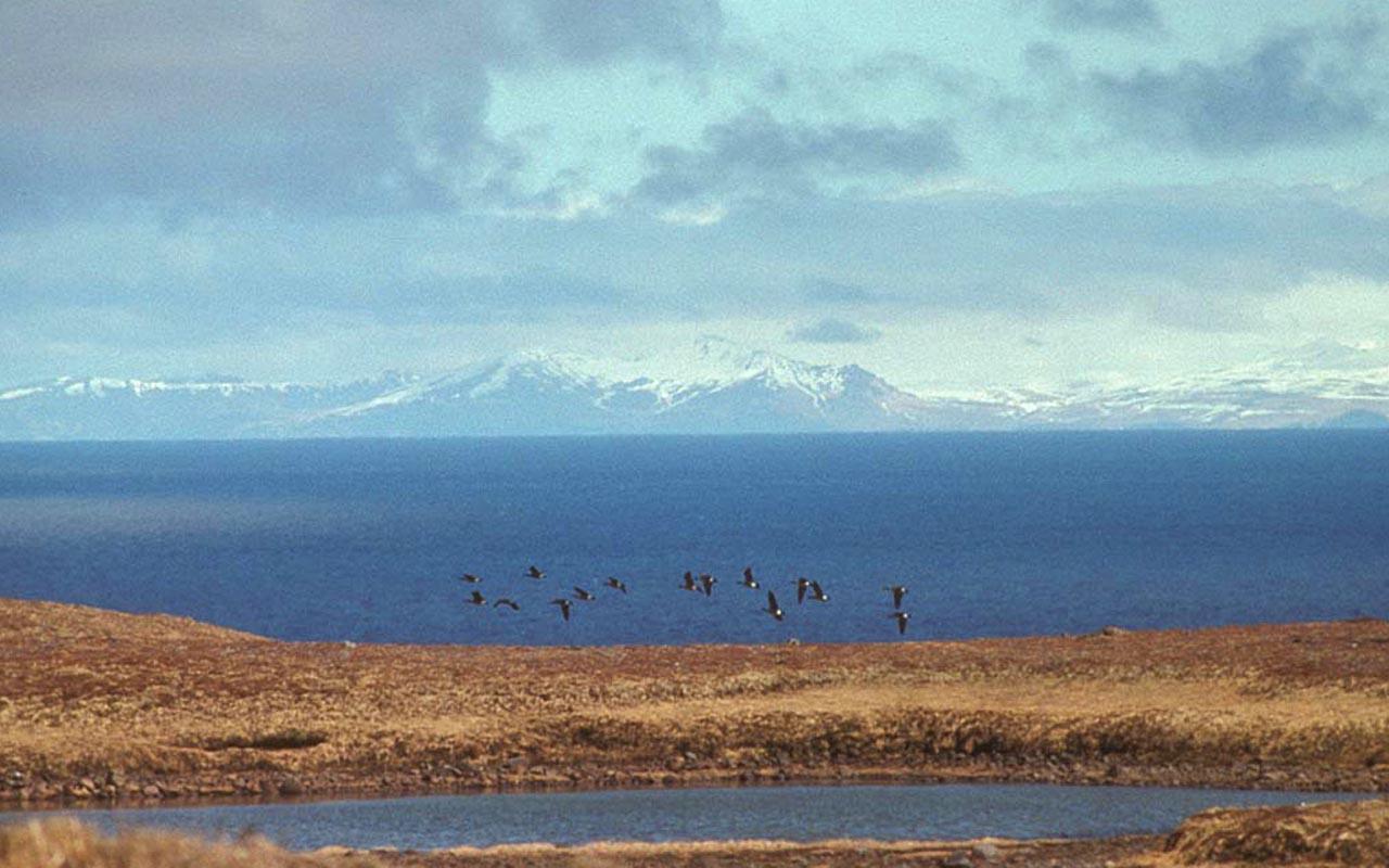 Aleutian Canada Geese in Flight Over Amchitka Island